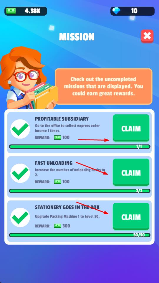 3、完成各類任務如前往辦公室收取快遞訂單收入、增加卸貨碼頭數(shù)量、升級包裝機等級等后,點擊CLAIM按鈕領取獎勵,獲得金幣等資源,助力工廠發(fā)展。
