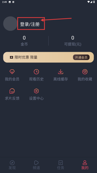 2、在個(gè)人中心頁面,點(diǎn)擊登錄/注冊(cè)區(qū)域,進(jìn)入賬號(hào)操作界面。