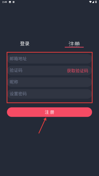 4、在注冊(cè)頁面填寫郵箱地址、驗(yàn)證碼、昵稱、設(shè)置密碼,點(diǎn)擊注冊(cè)按鈕完成賬號(hào)注冊(cè)。