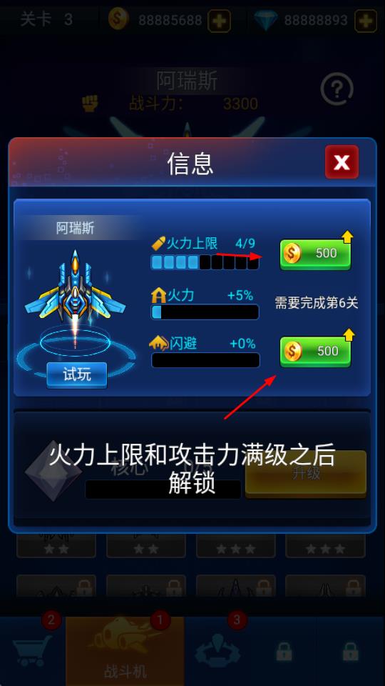1、可對戰(zhàn)斗機進行升級,花費金幣提升火力上限、火力、閃避等屬性。