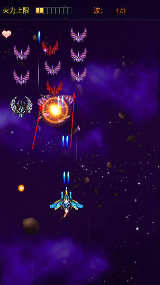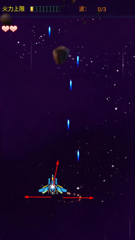 2、在太空場景中,操控戰(zhàn)斗機左右、上下移動,躲避隕石等障礙物。