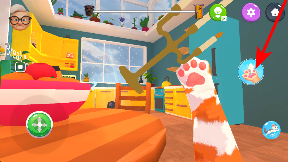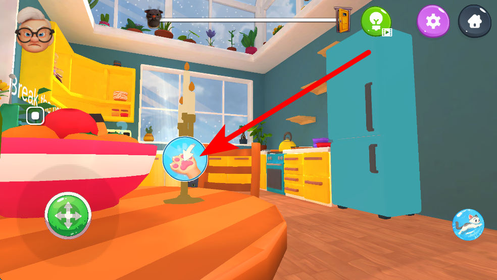3、接著,還可以尋找其他可互動的物品,比如桌上的擺件等,再次點擊操作按鈕,讓貓咪對這些物品進行搞怪操作,弄倒它們。