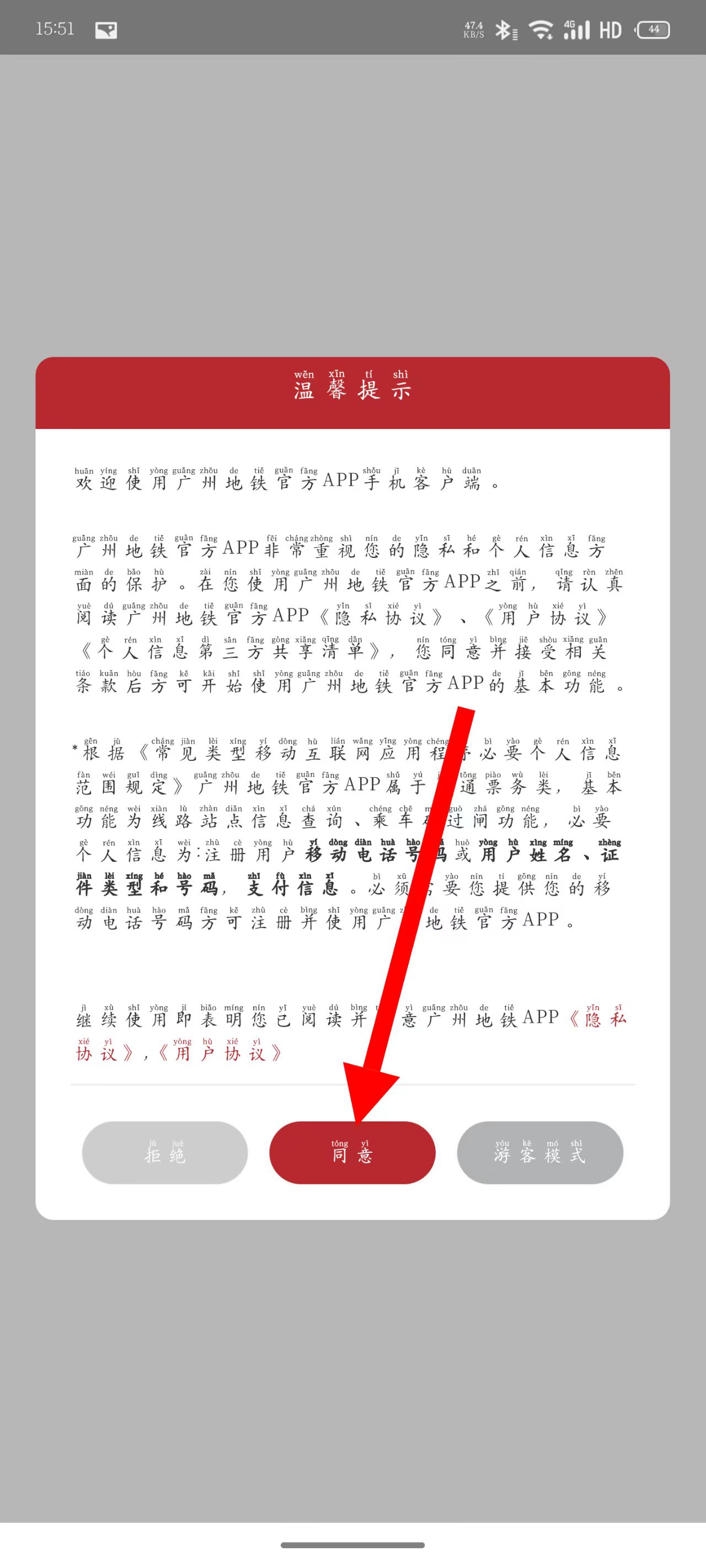 1、打開廣州地鐵,在溫馨提示頁面點(diǎn)擊同意。