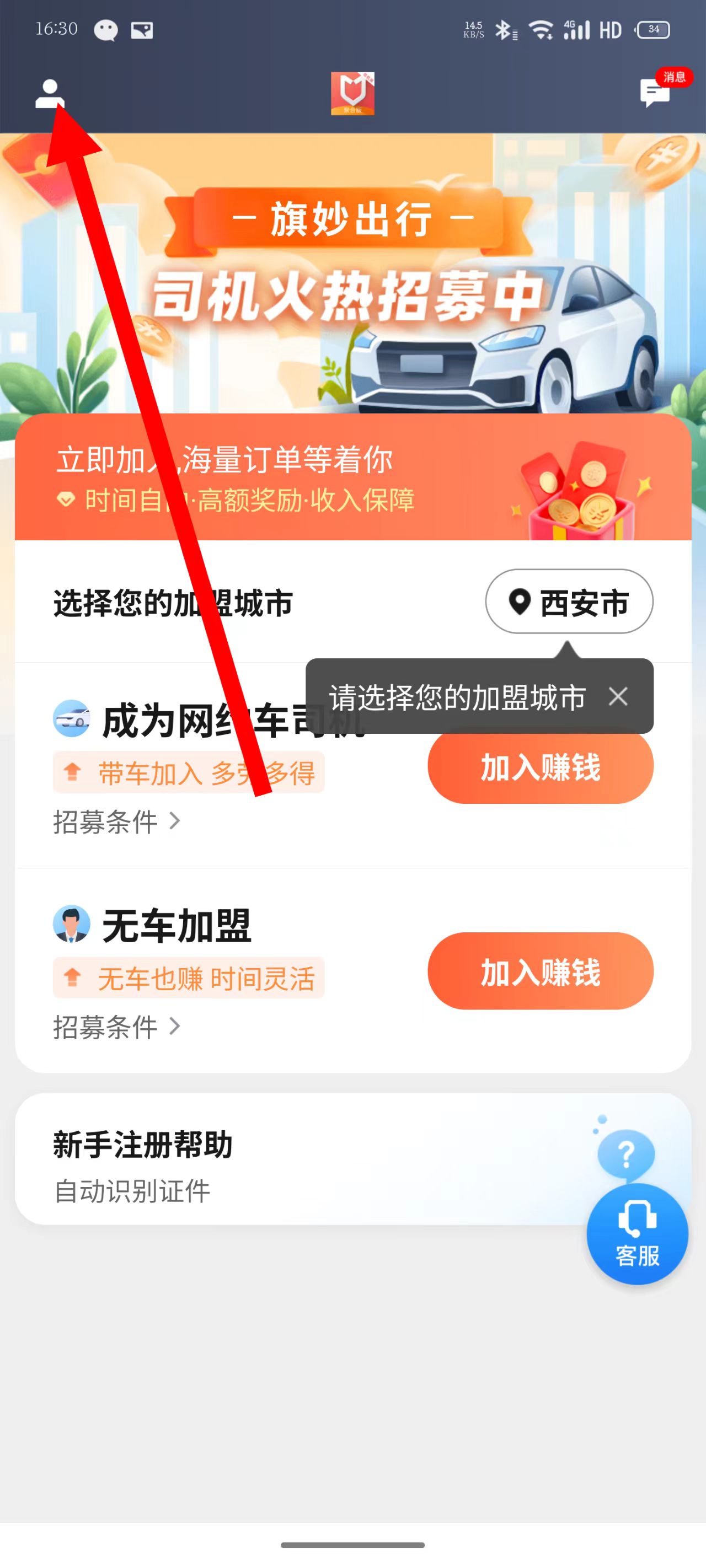 1、打開旗妙出行司機端聚合版,點擊左上角頭像圖標(biāo)。