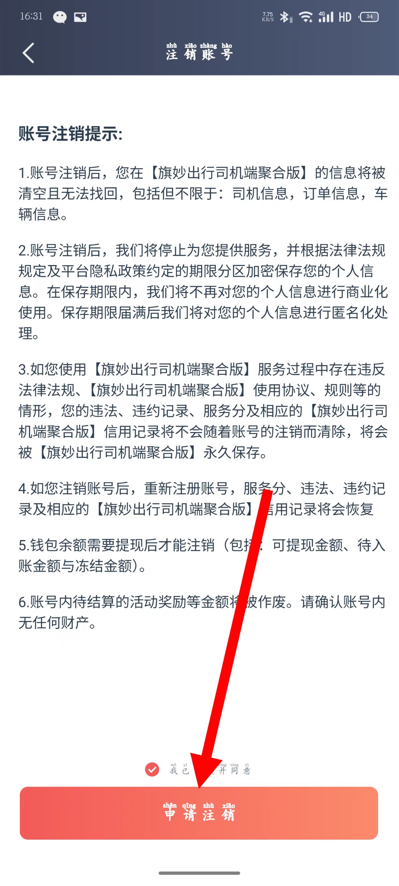 5、閱讀賬號注銷提示后,勾選同意相關(guān)條款,點擊申請注銷,按照提示完成后續(xù)操作。
