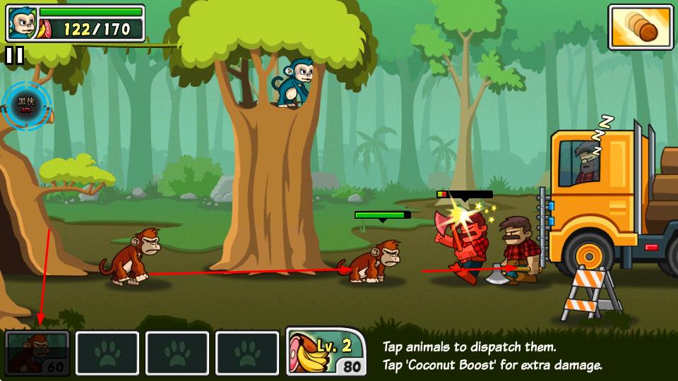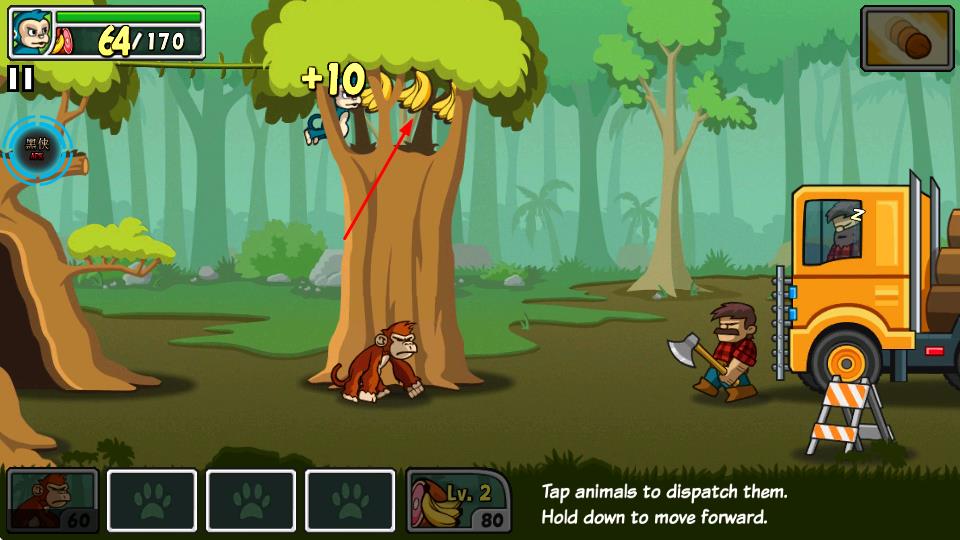 3、在樹上可獲取香蕉等資源,增加分數(shù),同時能召喚其他動物協(xié)助戰(zhàn)斗。