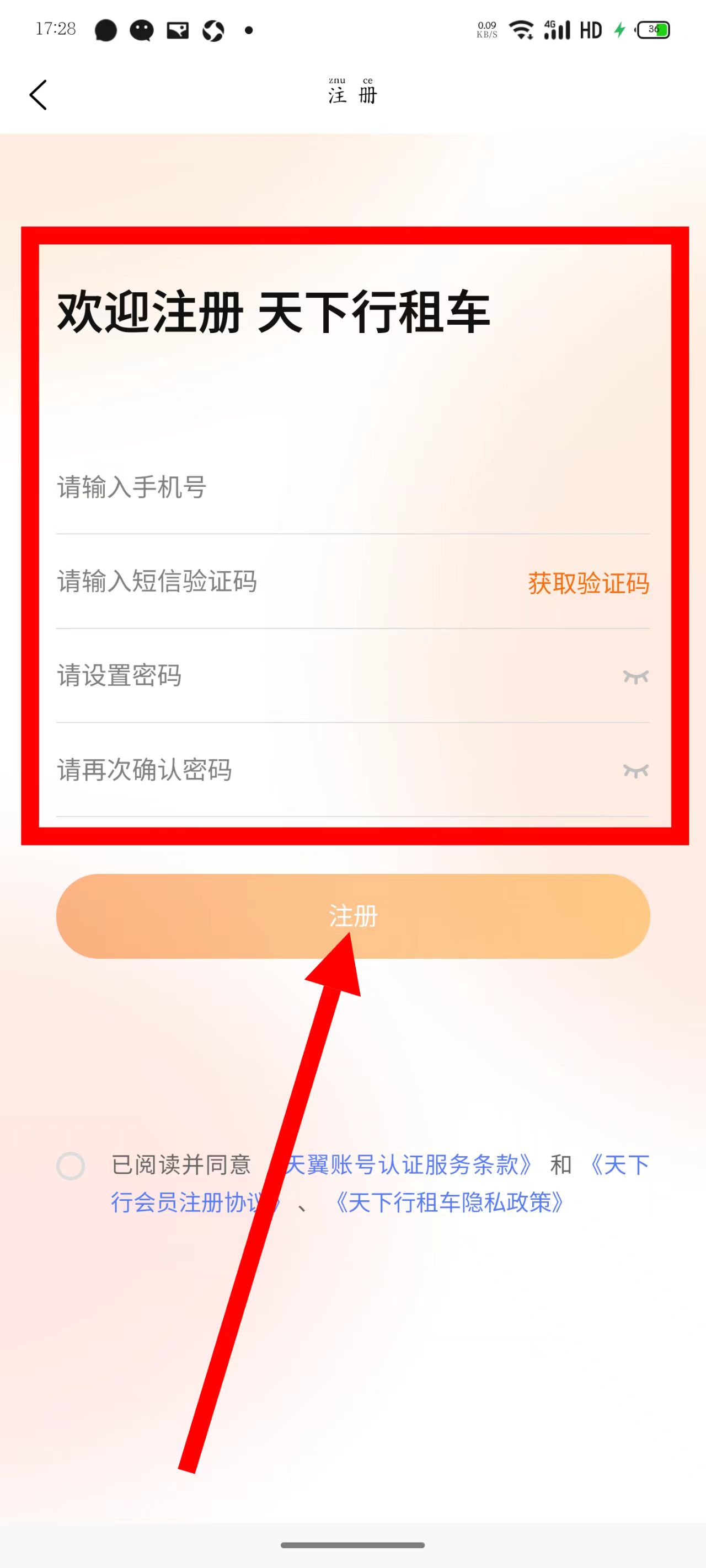 4、在注冊頁面,依次輸入手機號等信息,勾選后,點擊注冊完成操作。