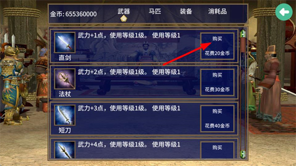 1、在商店界面中,點(diǎn)擊購(gòu)買(mǎi)按鈕可獲取武器,如直劍能提升1點(diǎn)武力,根據(jù)戰(zhàn)斗需求選擇合適武器。
