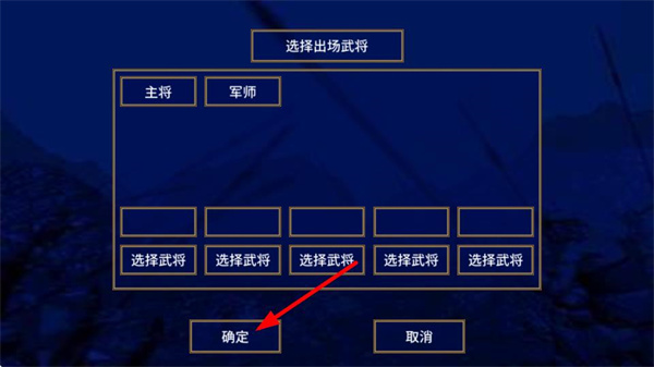 3、在選擇出場(chǎng)武將界面,選定主將、軍師及其他武將后,點(diǎn)擊確定按鈕即可確認(rèn)陣容,開(kāi)啟戰(zhàn)役。