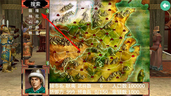 4、利用搜索功能,在勢(shì)力地圖中查找武將或資源點(diǎn),可擴(kuò)充武將陣容或獲取資源,助力勢(shì)力發(fā)展。