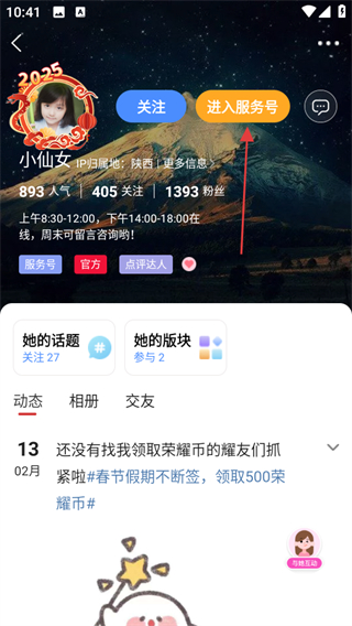 3、在客服頁(yè)面,點(diǎn)擊進(jìn)入服務(wù)號(hào),進(jìn)入服務(wù)號(hào)相關(guān)頁(yè)面。