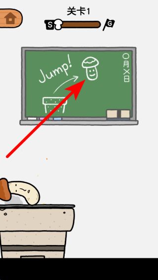 2、在關(guān)卡中,會遇到不同的場景和障礙,首先會看到在關(guān)卡1的黑板上,有Jump!以及蘑菇圖案的提示,要按照這些提示,操控蘑菇進行跳躍等操作。