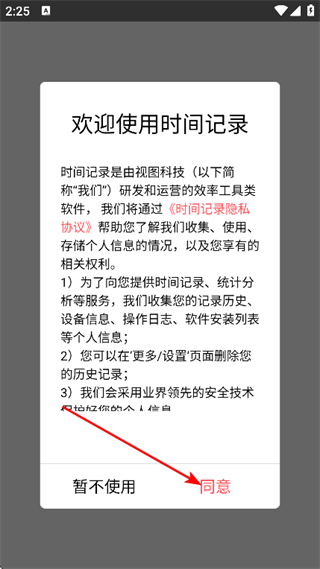 1、在歡迎使用時(shí)間記錄彈窗中,點(diǎn)擊同意,進(jìn)入主頁面。