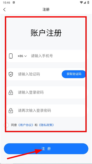 4、在注冊(cè)頁面,依次輸入手機(jī)號(hào)等信息,勾選同意后,點(diǎn)擊注冊(cè)完成操作。