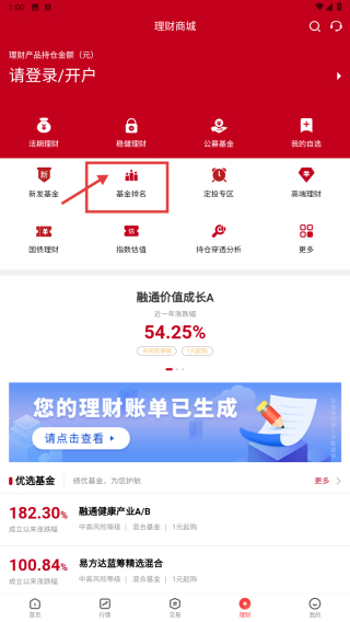 2、在理財(cái)商城頁(yè)面,點(diǎn)擊基金排名選項(xiàng),進(jìn)入基金排名界面。