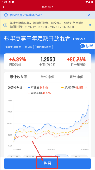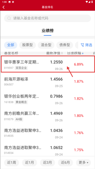 3、在基金排名界面,找到銀華惠享三年定期開放混合條目,點(diǎn)擊進(jìn)入基金詳情頁(yè)。
