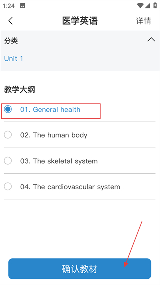 3、在課程頁面,選擇教學(xué)大綱內(nèi)容后,點擊確認(rèn)教材。