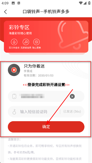 4、在開通設(shè)置頁(yè)面后,輸入短信驗(yàn)證碼,點(diǎn)擊確定,完成彩鈴開通設(shè)置。
