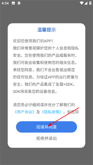 1、在溫馨提示彈窗中,點(diǎn)擊閱讀并同意,進(jìn)入APP首頁(yè)。