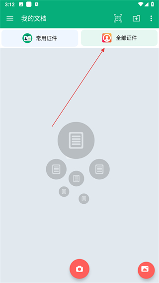1、打開文字識(shí)別全能王APP,進(jìn)入我的文檔頁面,點(diǎn)擊全部證件選項(xiàng)。