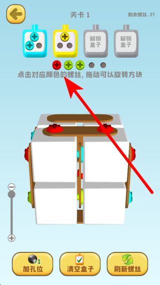 1、進入后,點擊開始消除進入關卡,需點擊對應顏色的螺絲,拖動還能旋轉方塊,以此來進行螺絲消除,推進關卡進程。