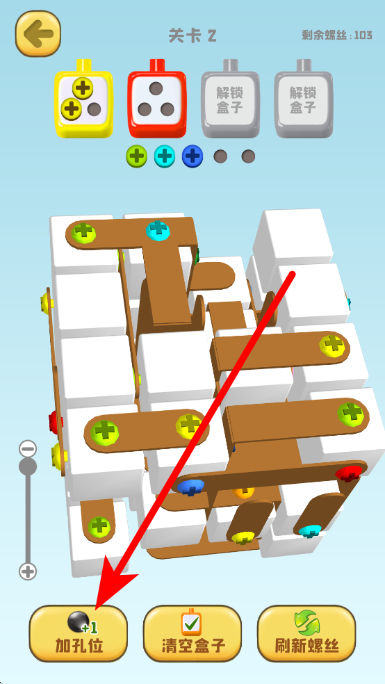 3、官咖沒驚醒中如果碰到困難,可以利用下方加孔位的道具,這些道具可用于后續(xù)關卡的挑戰(zhàn),也能為方塊等元素的操作提供更多便利。