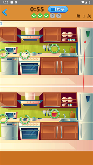4、查看廚房右側(cè)冰箱,發(fā)現(xiàn)綠色部分的差異,點擊標(biāo)記完成找茬。