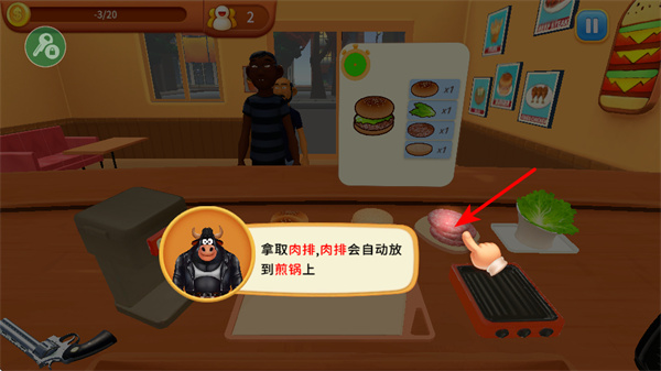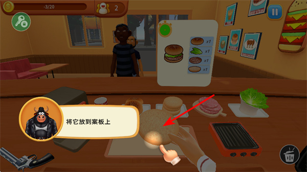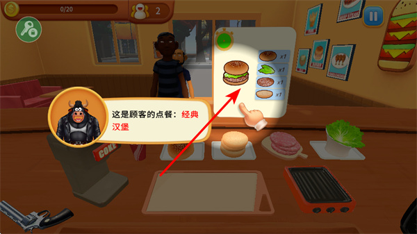 1、查看顧客的點餐提示如經(jīng)典漢堡,明確需要制作的漢堡組成,完成訂單基礎(chǔ),識別食材要求。