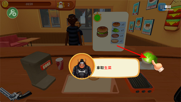4、拿取生菜,生菜是漢堡的配菜食材,按訂單要求依次添加,完成漢堡的組裝,交付給顧客獲取收益。