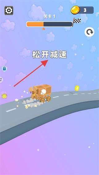 2、完成小車組裝后進(jìn)入關(guān)卡,手指按住屏幕,小車便會(huì)開始移動(dòng),沿著道路向前行駛,途中留意躲避障礙,同時(shí)盡量收集道路上的金幣,保持按住狀態(tài)讓小車持續(xù)平穩(wěn)前進(jìn)。