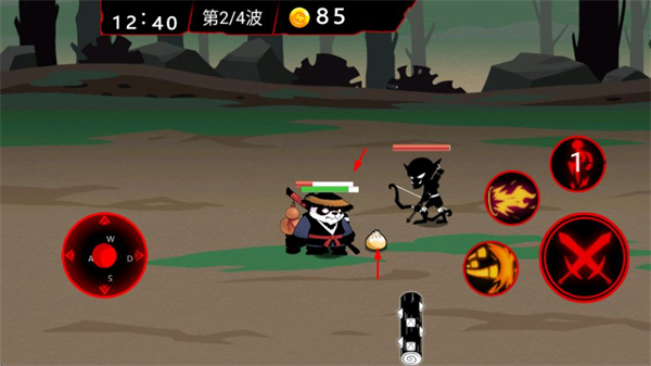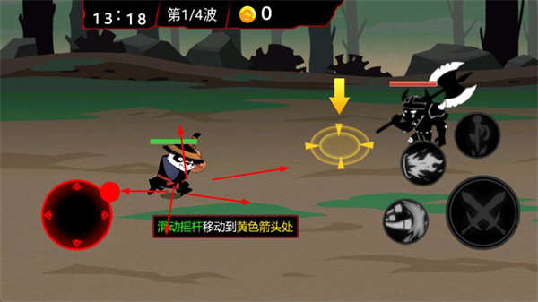 1、在游戲場(chǎng)景中,滑動(dòng)搖桿操控熊貓角色移動(dòng)到指定的黃色箭頭位置,準(zhǔn)備應(yīng)對(duì)敵人。