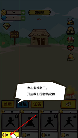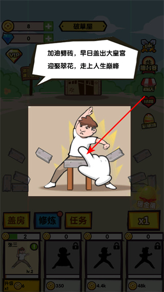 2、跟隨手勢指引,點擊劈磚的張三,進行劈磚的操作,積累了資源來提升角色和建筑的等級。
