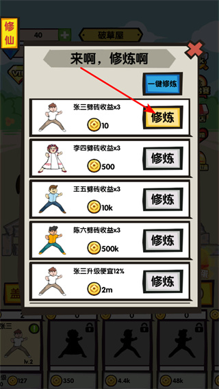 3、在來啊,修煉啊界面,點擊張三對應的修煉按鈕,可提升張三的劈磚收益,助力資源積累。