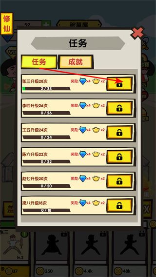 2、豐富成長線:從解鎖首個角色張三開啟劈磚之旅,到蓋房、結婚、挑戰(zhàn)擂臺,成長的線清晰且豐富,每個階段都有明確目標。