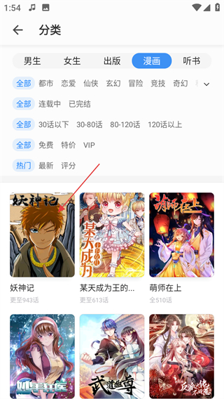 3、在漫畫分類頁(yè)面,選擇喜歡的漫畫,進(jìn)入漫畫詳情頁(yè)面。