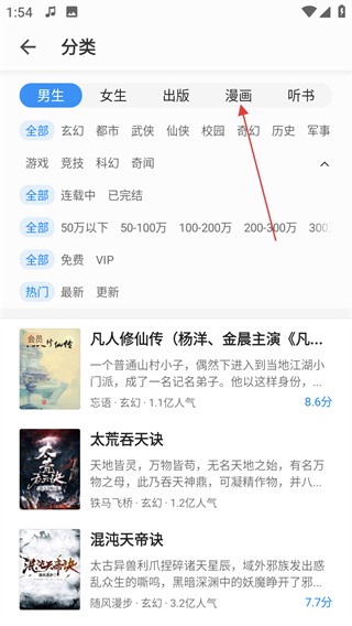 2、在分類頁(yè)面,點(diǎn)擊漫畫,進(jìn)入漫畫分類頁(yè)面。