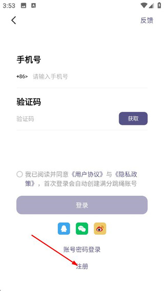 1、進(jìn)入應(yīng)用,在登錄頁(yè)面,點(diǎn)擊注冊(cè),進(jìn)入注冊(cè)流程。