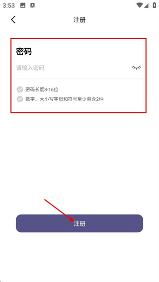 3、在密碼設(shè)置頁(yè)面,輸入符合要求的密碼后,點(diǎn)擊注冊(cè),完成注冊(cè)操作。