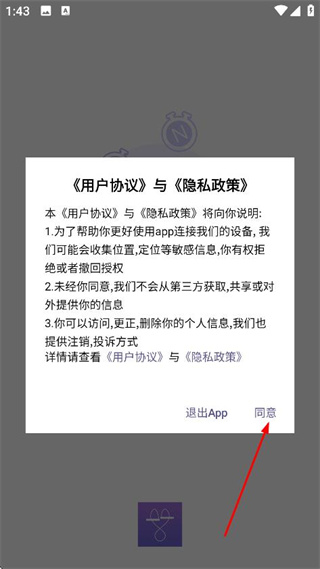 1、在用戶協(xié)議與隱私政策彈窗中,點擊同意,進入APP。