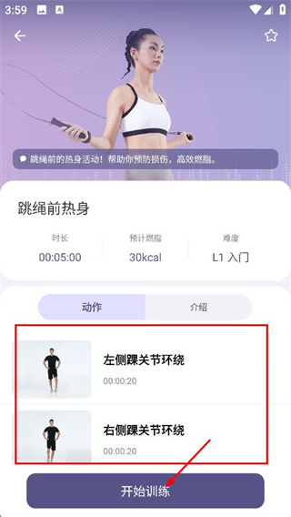 4、在課程詳情頁面,點擊開始訓練,開始跳繩前熱身訓練。