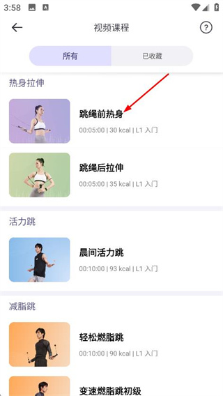 3、在視頻課程頁面,點擊跳繩前熱身課程,進入該課程詳情頁面。