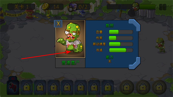 2、遇到普通僵尸時,可查看其數(shù)據(jù)面板,了解其血量、傷害等屬性,以便針對性地部署戰(zhàn)斗單位。