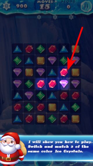 2、在寶石矩陣中,點擊相鄰的兩顆寶石,可交換它們的位置,若交換后有三顆及以上相同顏色寶石連成直線,就能消除這些寶石并得分。