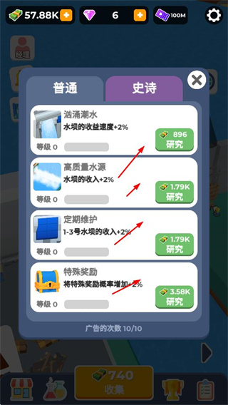 4、進入研究界面,可花費金幣對洶涌潮水高質(zhì)量水源等項目進行研究,提升水壩的收益速度、收入等。