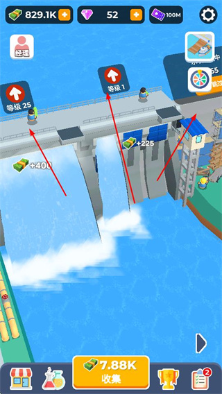 1、在水壩場(chǎng)景中,水壩有不同等級(jí),可通過升級(jí)提升水壩收益,點(diǎn)擊收集按鈕獲取水壩產(chǎn)生的金幣。