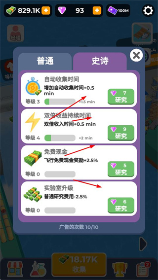 3、進(jìn)入研究界面,可花費(fèi)鉆石對(duì)自動(dòng)收集時(shí)間、雙倍收益持續(xù)時(shí)間等項(xiàng)目進(jìn)行研究,提升水壩的自動(dòng)收集效率等。