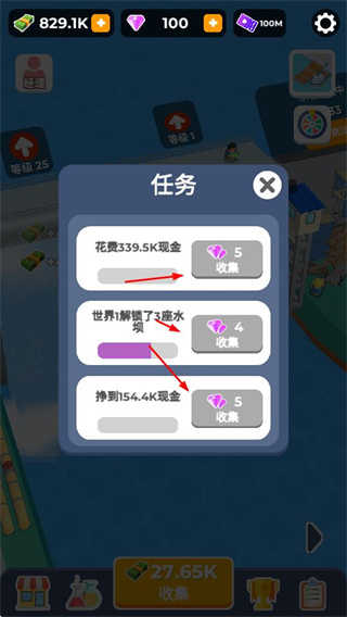 4、完成任務(wù)界面中的任務(wù),可領(lǐng)取鉆石獎(jiǎng)勵(lì),積累鉆石資源,用于水壩的升級(jí)、研究等操作。