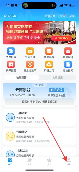 1、在地震預(yù)警首頁,點(diǎn)擊底部我的,進(jìn)入個(gè)人相關(guān)頁面。