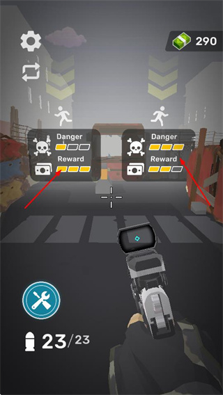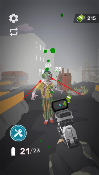 2、遇到敵人如小丑裝扮的角色時(shí),使用槍械射擊敵人,擊中后會(huì)有綠色點(diǎn)數(shù)等反饋,消滅敵人可獲取獎(jiǎng)勵(lì)。