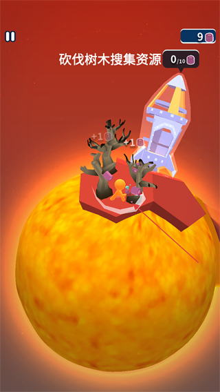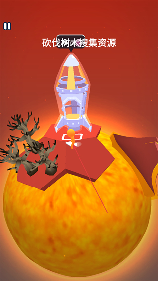 1、進入游戲,看到提示砍伐樹木搜集資源,操控角色靠近星球上的樹木進行砍伐,獲取資源。